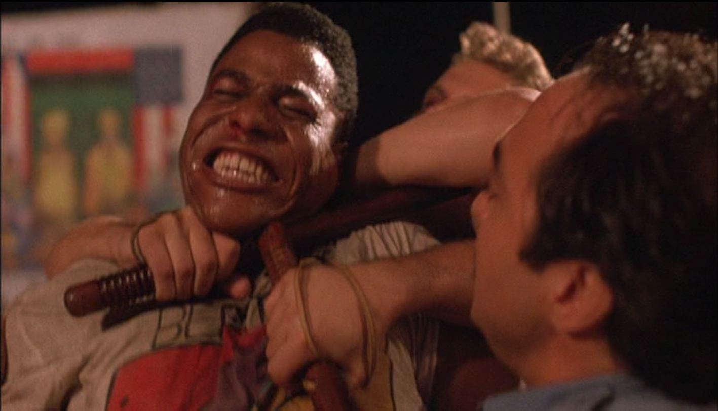 In American History X, we are witness to two major heinous crimes: a white-on-black curb-stomp and a gunshot murder of a young white teen at the hands of his black peer. In Do the Right Thing, a white cop strangles a young man in an over-zealous attempt to impede his assault of another white man. For both of these films, there is deep context to these acts; a long history of indoctrination in the White Power movement led to Derek Vinyard’s brutal attack on the black man in the opening scenes of American History X, and a long series of subtle set-ups give precedence to Danny Vinyard’s death in the final moments of the film. Likewise, the entire plot of Do the Right Thing is slowly revealed in aid of building tension toward the final confrontation between Sal’s white Italian family and the rest of the neighborhood.