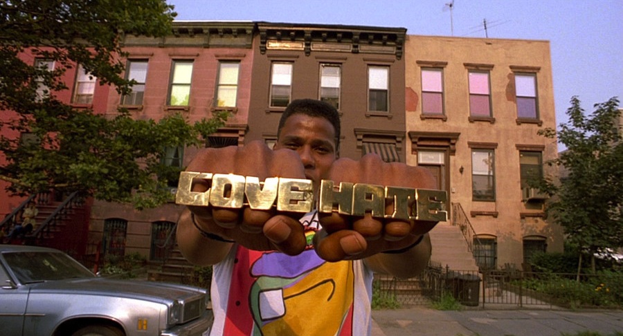 “Violence as a way of achieving racial justice is both impractical and immoral. It is impractical because it is a descending spiral ending in destruction for all. The old law of an eye for an eye leaves everybody blind. It is immoral because it seeks to humiliate the opponent rather than win his understanding; it seeks to annihilate rather than to convert. Violence is immoral because it thrives on hatred rather than love. It destroys a community and makes brotherhood impossible. It leaves society in monologue rather than dialogue. Violence ends by defeating itself. It creates bitterness in the survivors and brutality in the destroyers.” ~ Dr. Martin Luther King, Jr. “I think there are plenty of good people in America, but there are also plenty of bad people in America and the bad ones are the ones who seem to have all the power and be in these positions to block things that you and I need. Because this is the situation, you and I have to preserve the right to do what is necessary to bring an end to that situation, and it doesn’t mean that I advocate violence, but at the same time I am not against using violence in self-defense. I don’t even call it violence when it’s self-defense, I call it intelligence.” ~ Malcolm XThe King quote states that physical uprising antithetical to working for a better world, while X states self-defense (however he defines the term) is absolutely necessary for survival. The visual motif of King and X is persistent throughout Do the Right Thing, representing the significance of the duality Lee is trying to get across. Mookie embodies this struggle; having had a good relationship with Sal and his sons, he is also being inextricably tied to his black friends and family. This culminates in Mookie’s crucial decision to start off the riot by tossing a trash can through the window, effectively stating publicly whose side he was on.