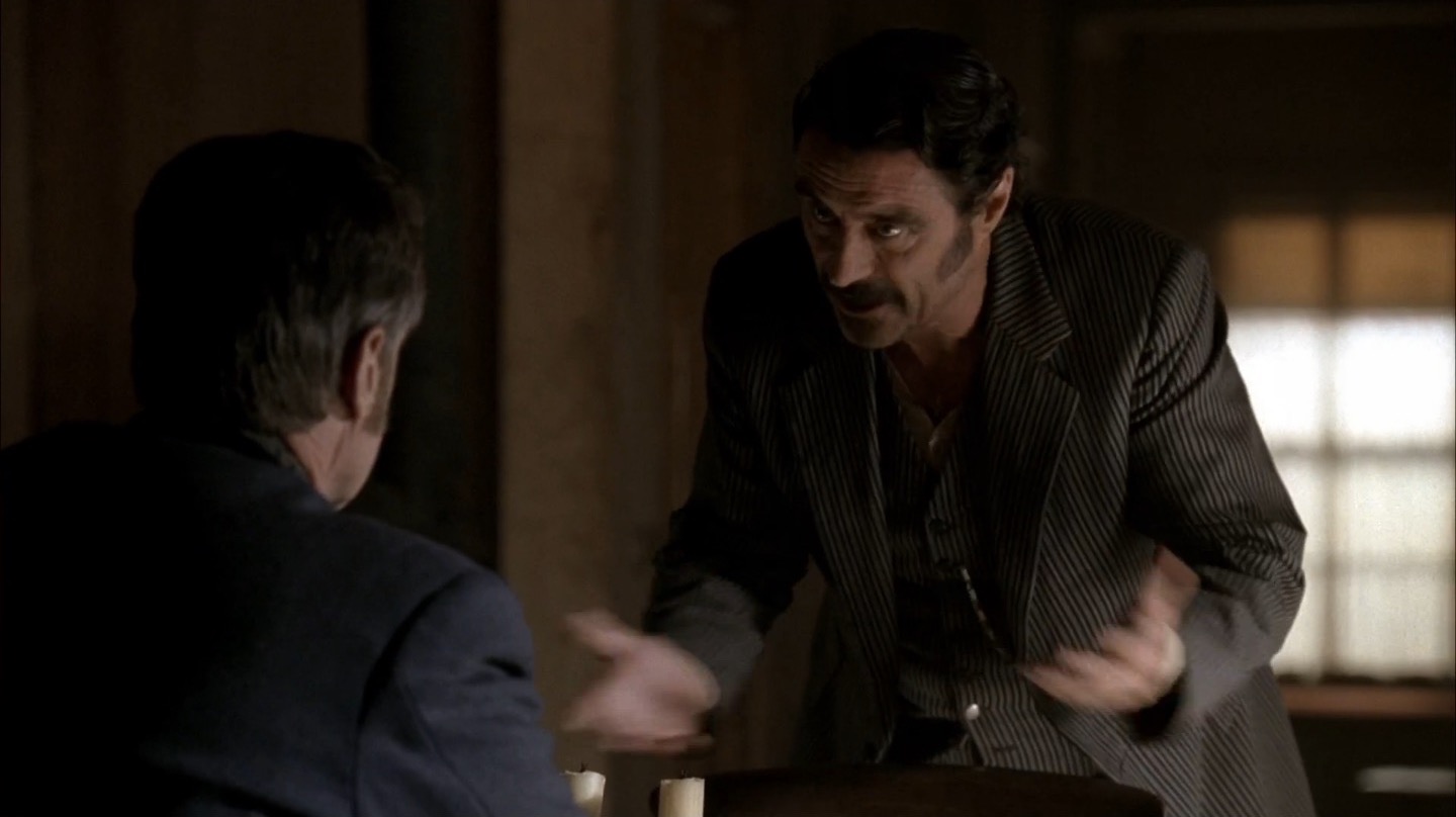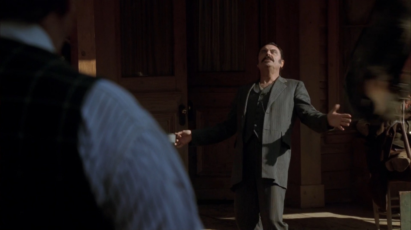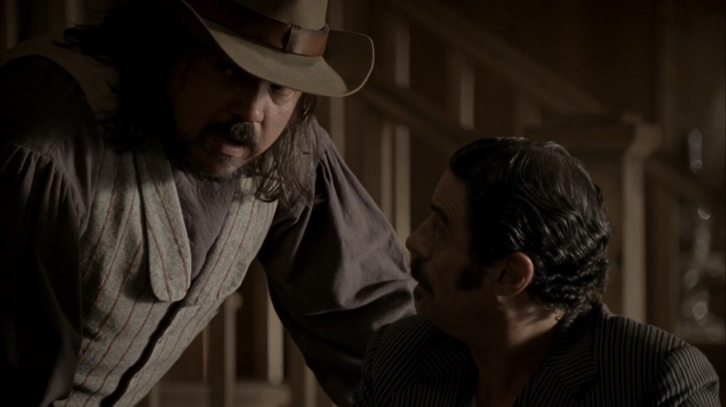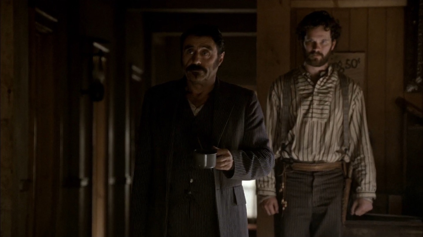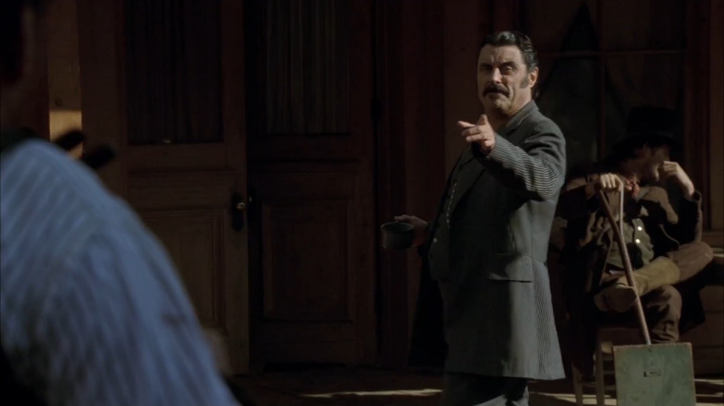 J and I pay particular attention to Deadwood‘s commentary on government in this episode. It remains to be seen if the show will take a firm stance on whether government and laws are benevolent components of society, but we already note the direct link between bribery/protection money and taxes. The generally farcical nature of this and past episodes on the topic of leadership would lead me to believe Milch and Co. are fairly cynical about the government, but we’ll see how things shape up in coming seasons.