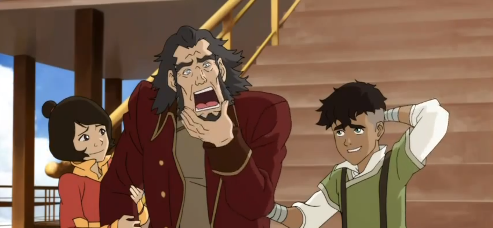 As mentioned in the podcast, here is the misleading M. Night Shyamalan interview conducted by series creators Mike DiMartino and Bryan Konietzko. We also brought up the fact that Mako and Bolin visit the same apartment complex in “The Earth Queen” as Zuko and Iroh in “The Earth King,” as evidenced in this screenshot comparison.