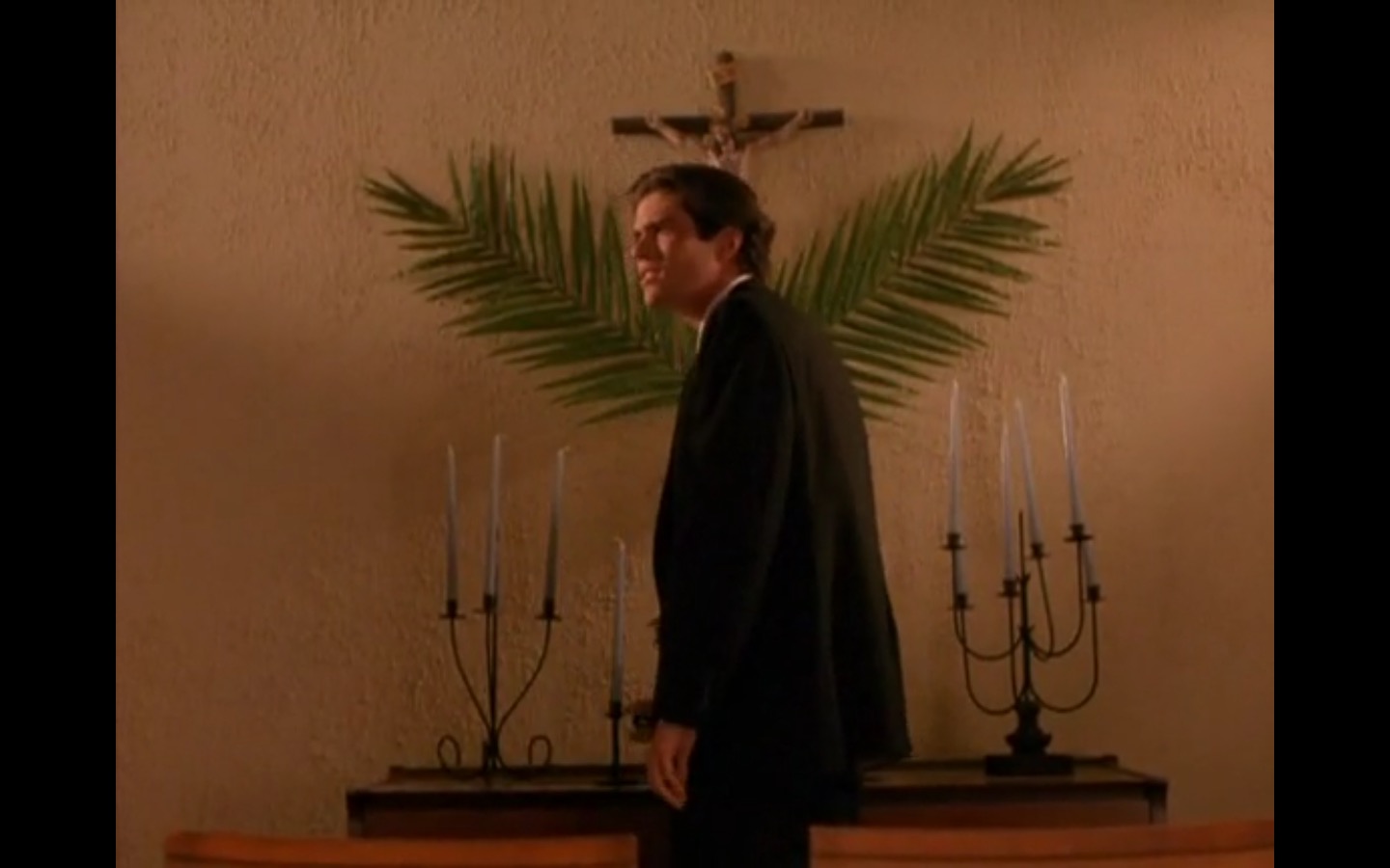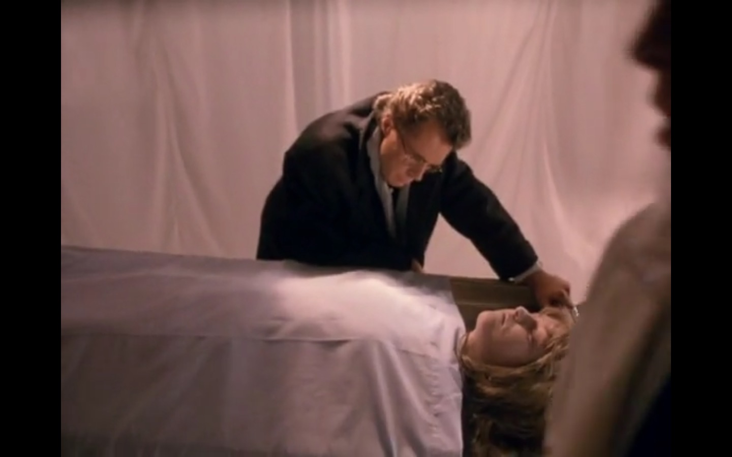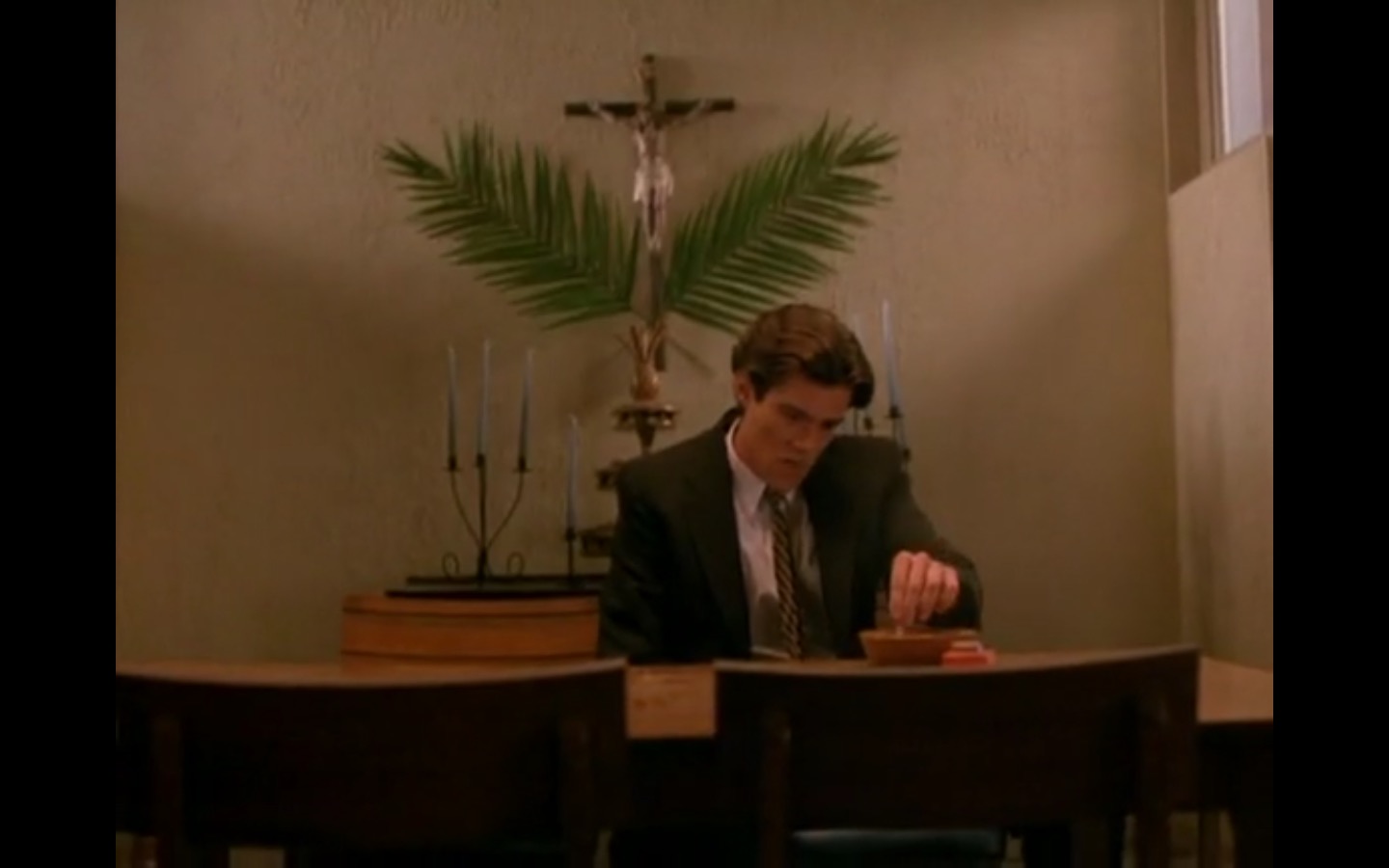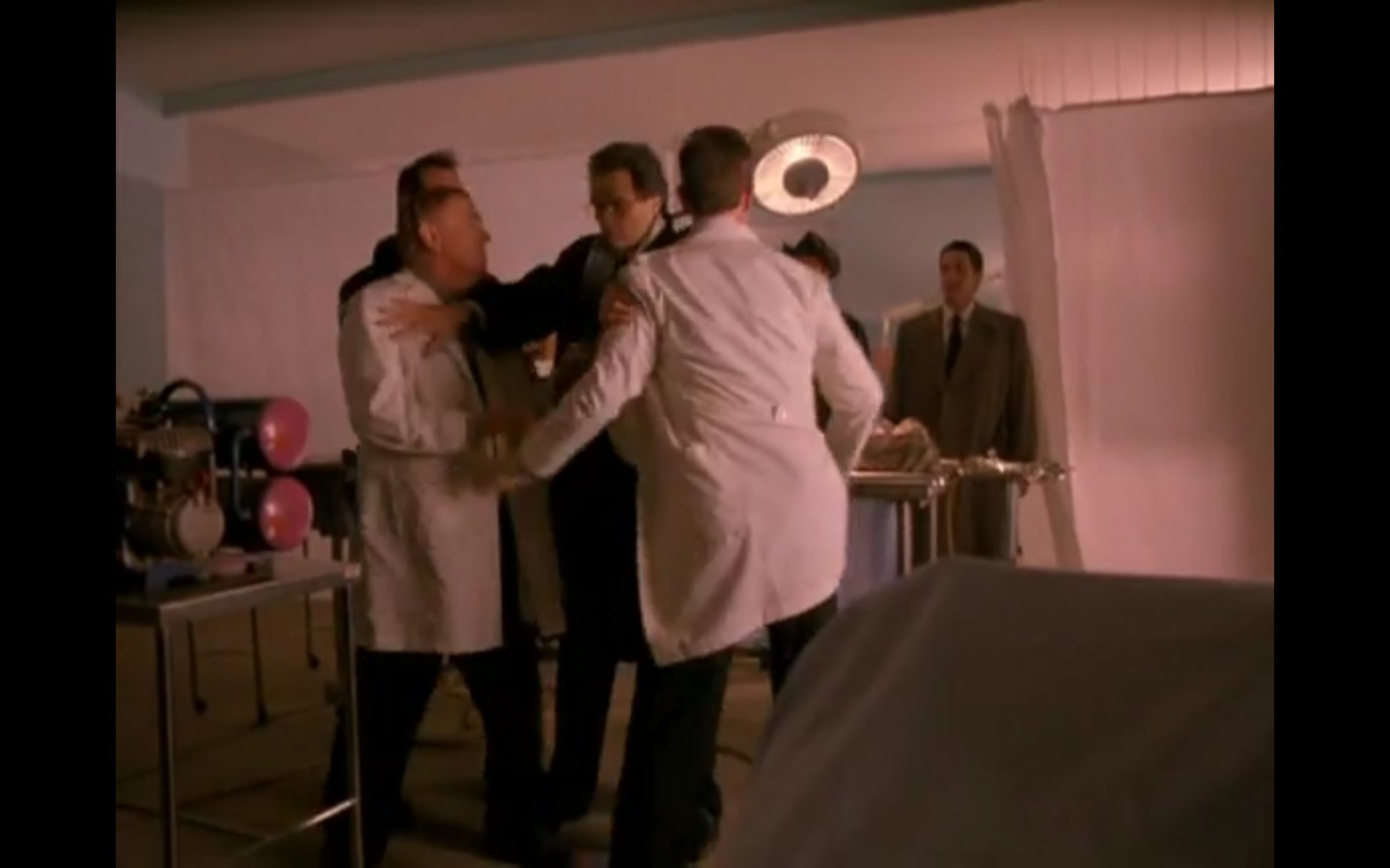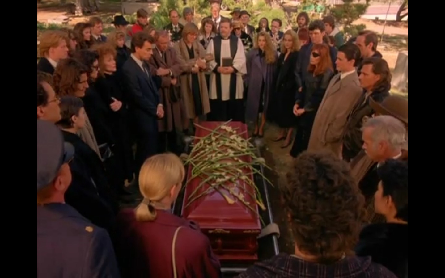 The centerpiece of the episode is undoubtedly the funeral. In preparing for Laura’s (Sheryl Lee) burial, Bobby (Dana Ashbrook) wrestles with his father and James (James Marshall) contemplates attending at all. Once there, the two quickly find themselves at odds, angrily lunging across the space in slow motion.