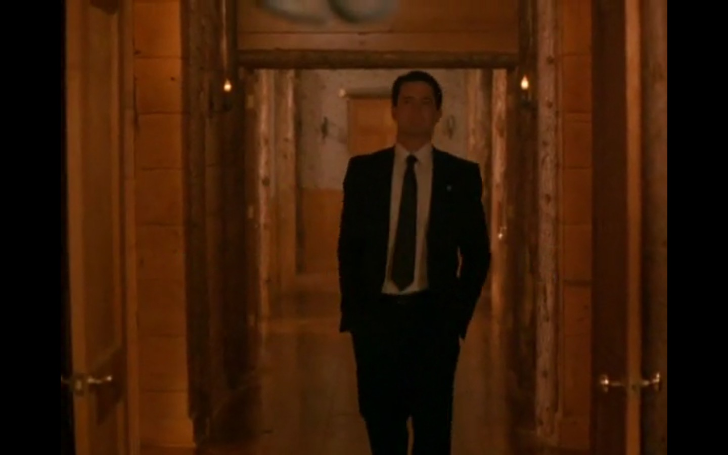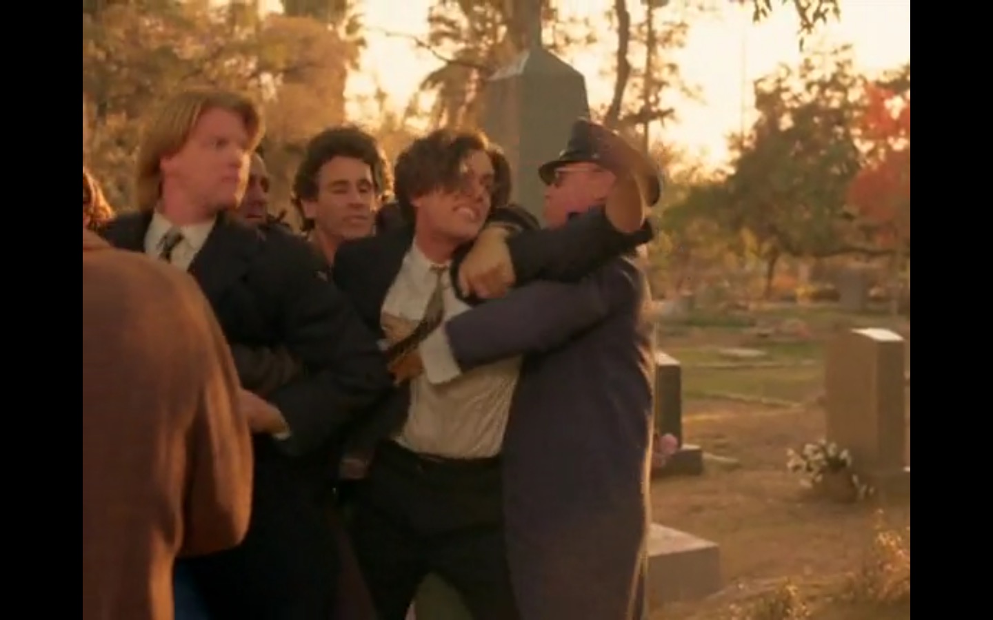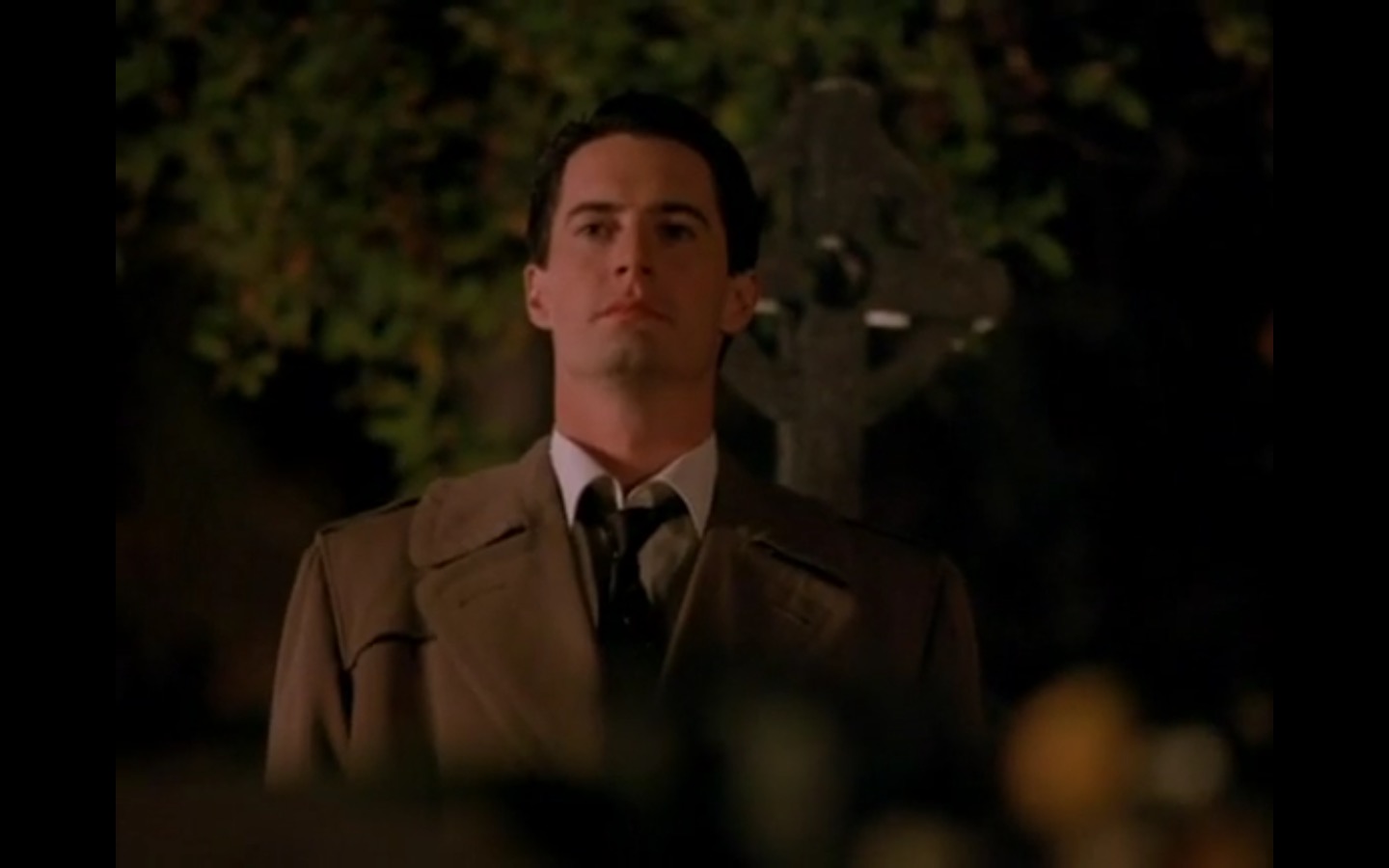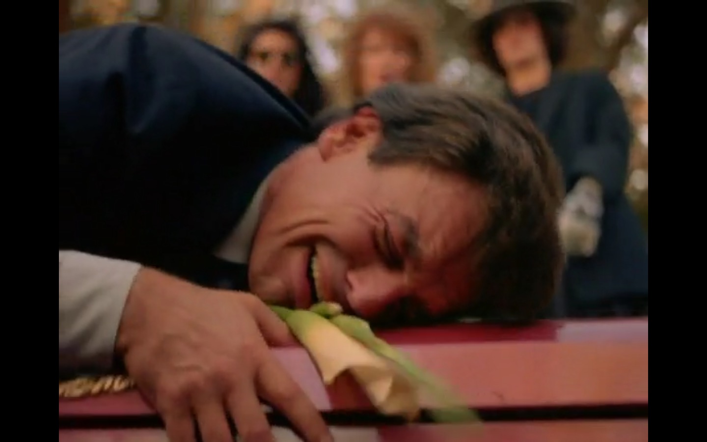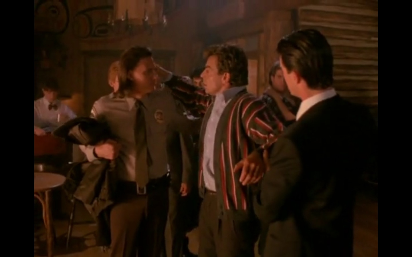 The centerpiece of the episode is undoubtedly the funeral. In preparing for Laura’s (Sheryl Lee) burial, Bobby (Dana Ashbrook) wrestles with his father and James (James Marshall) contemplates attending at all. Once there, the two quickly find themselves at odds, angrily lunging across the space in slow motion.