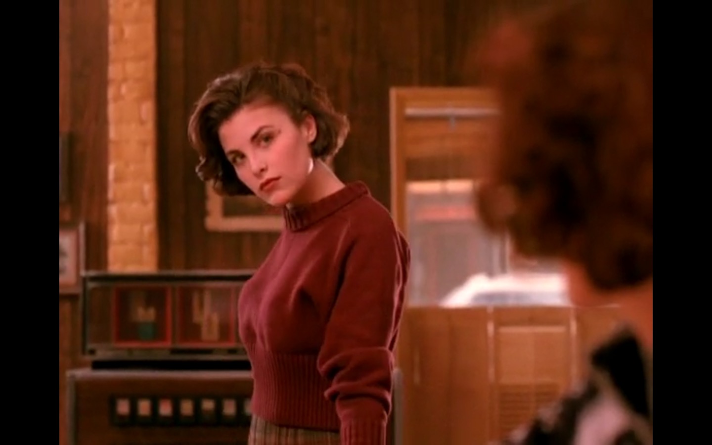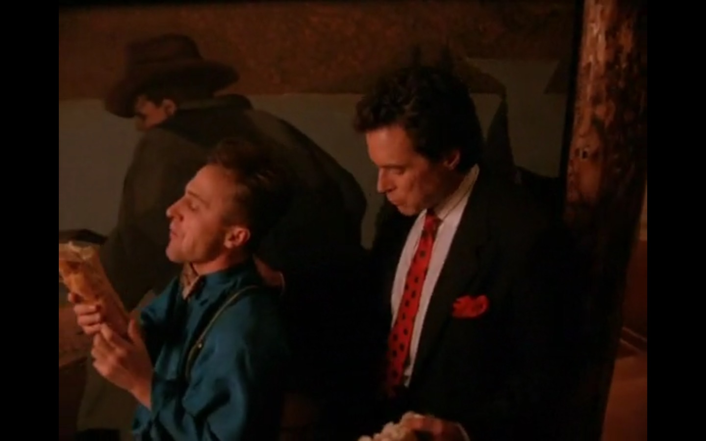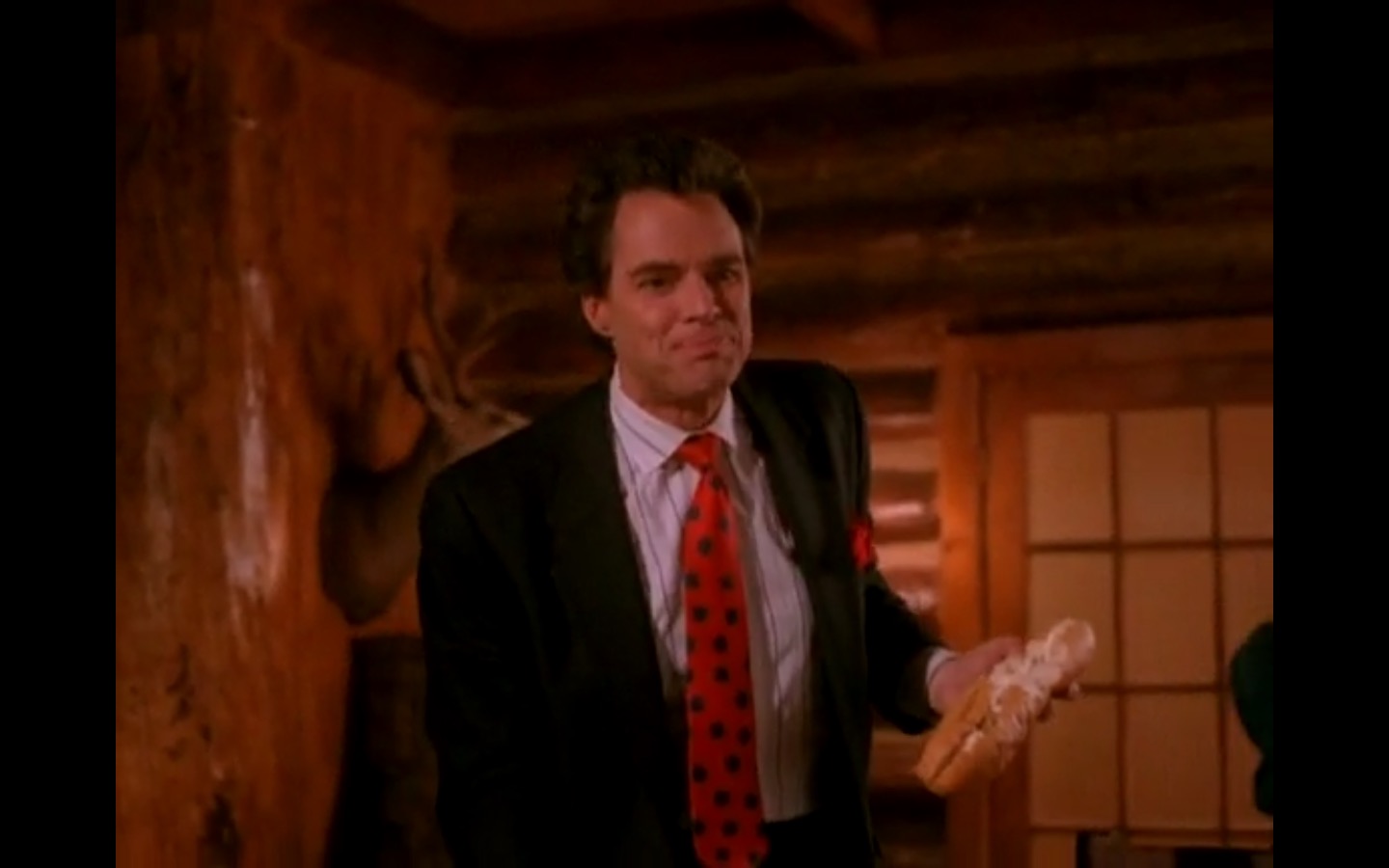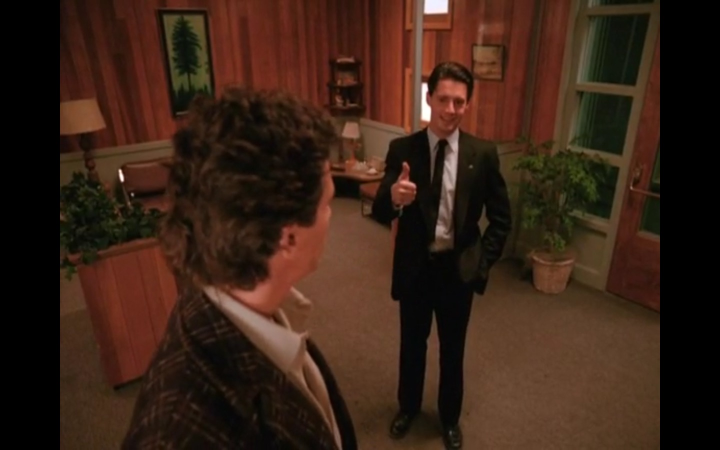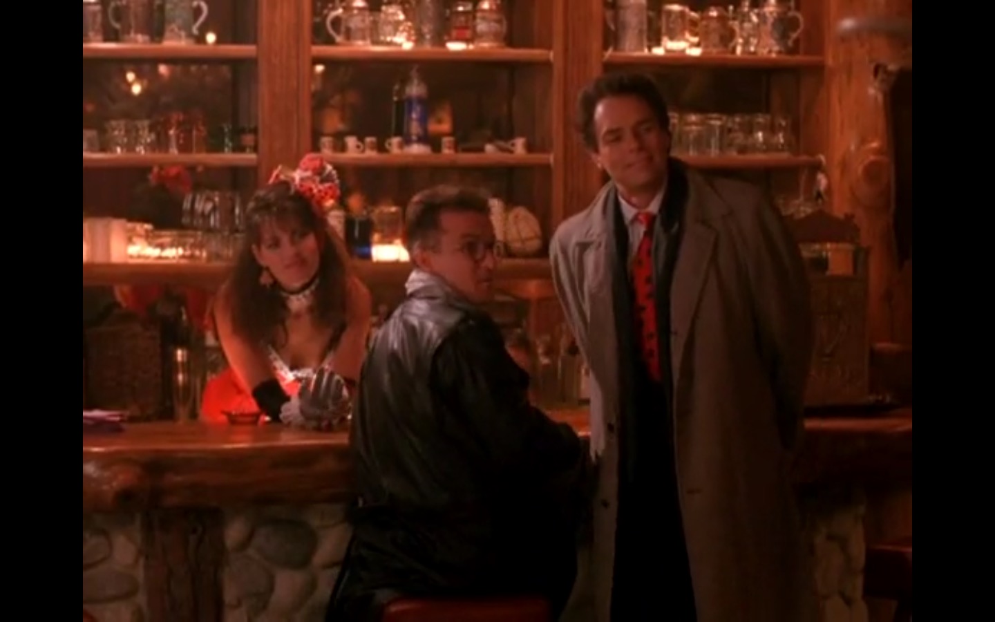 Across town, Mike (Gary Hershberger) and Bobby (Dana Ashbrook) find themselves in hot water with Leo. They don’t have the other half of the money they owe Leo for drugs because the cash remains locked up in Laura’s safe deposit box. This sinister narrative thread clashes with the rather tame story of Ed (Everett McGill) and Nadine (Wendy Robie) as his attempts to escape his marriage are foiled entirely on accident. I’m still not sure what to make of a plot about curtains, but it all adds to the strange brand of “weird” Twin Peaks is known for.